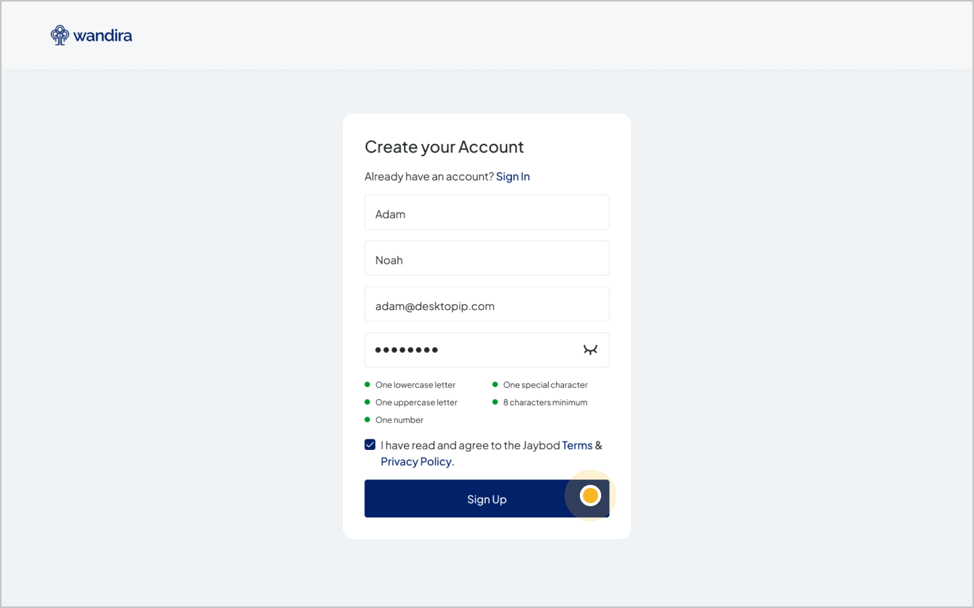 c. Masukkan nama, alamat email, dan kata sandi. Agar kata sandi Anda kuat, buatlah minimal 8 karakter dengan kombinasi huruf besar, huruf kecil, karakter khusus & angka.Kemudian, klik Sign Up.